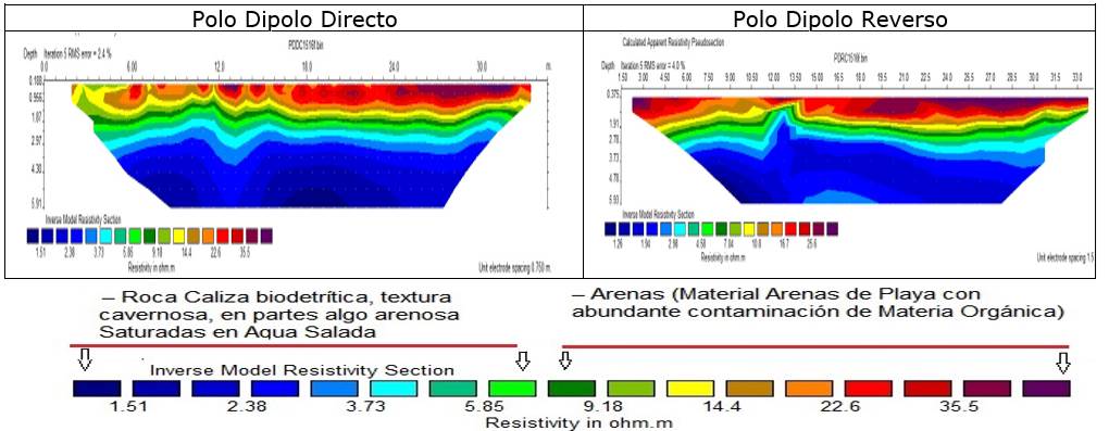 De acuerdo a los criterios expresados se infiere que los bajos valores de resistividad obtenidos en la parte más profunda del corte (2-6 m), del orden de 1,2–8,5 Ω.m, se correlacionan con las calizas cavernosas calcareníticas saturadas en agua salada de mar con alto contenida de cloruro de sodio y muy mineralizada (figura 4).