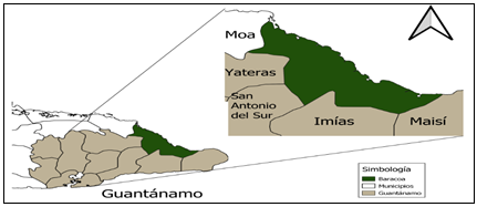El municipio de Baracoa se encuentra ubicado en la costa norte de la provincia de Guantánamo, en la parte oriental de la isla de Cuba. Limita con el municipio Maisí al este, al sur con Imías y San Antonio del Sur, y al oeste con Yateras y Moa (Figura 1). Baracoa se caracteriza por una diversidad impresionante en términos físico geográficos, geológicos, geomorfológicos, tectónicos, climáticos e hidrogeológicos.
