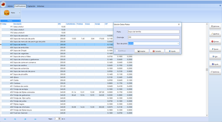 2. Codificadores: consisten en un conjunto de formularios de entrada para captar los datos primarios del sistema como son platos, tipos de platos, ingredientes, servicios, tipo de menú, tipo de ración, comedores, unidades, empresas, almacenes y comensales.