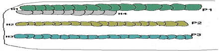 Figura 1. Esquema de descarga de los viajes de camiones en las hileras para formar las pilas del secado solar en las plazoletas. (P1 pila 1, P2 pila 2, P3 pila 3, H1 hilera 1, H2 hilera 2, H3 hilera 3, H4 hilera 4).