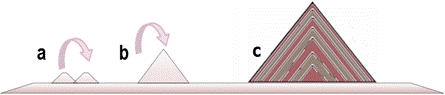 Figura 2. Proceso de remonte de hileras y formación de las pilas para secado solar. a) Remonte de la 1ra hilera sobre la segunda, b). Pila de menor altura formada por dos hileras. c) Pila terminada con todas sus hileras remontadas.