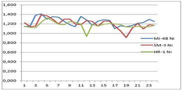 Figura 5. Comportamiento del níquel en las muestras tomadas en las plazoletas, en la SM-3 y en HR-1.