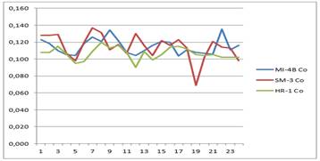 Figura 6. Comportamiento del cobalto en las muestras tomadas en las plazoletas, en la SM-3 y en HR-1.