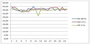 Figura 7. Comportamiento del hierro en las muestras tomadas en las plazoletas, en la SM-3 y en HR-1.