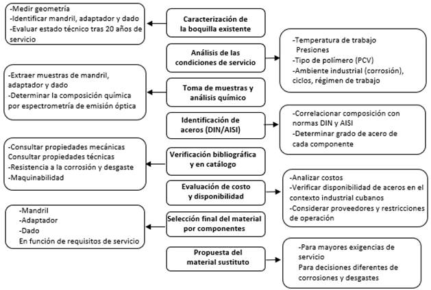 La propuesta aplicada fue organizada en etapas sucesivas que integran ingeniería inversa, análisis de servicio y verificación normativa y bibliográfica. Esta secuencia metodológica, guía desde la caracterización de la boquilla existente y la determinación de la composición química hasta la identificación de los aceros según normas DIN/AISI, la evaluación de propiedades, costos y disponibilidad, y la selección final de materiales y posibles sustitutos para cada componente. La metodología propuesta no solo estructura el proceso seguido, ofrece además un esquema replicable para otras aplicaciones industriales donde se requiera seleccionar materiales de boquillas de extrusión a partir de equipos sin información detallada del fabricante original.
