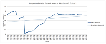 Figura 4. Gráfica comportamiento del factor de potencia para una aleación de Ac 45.